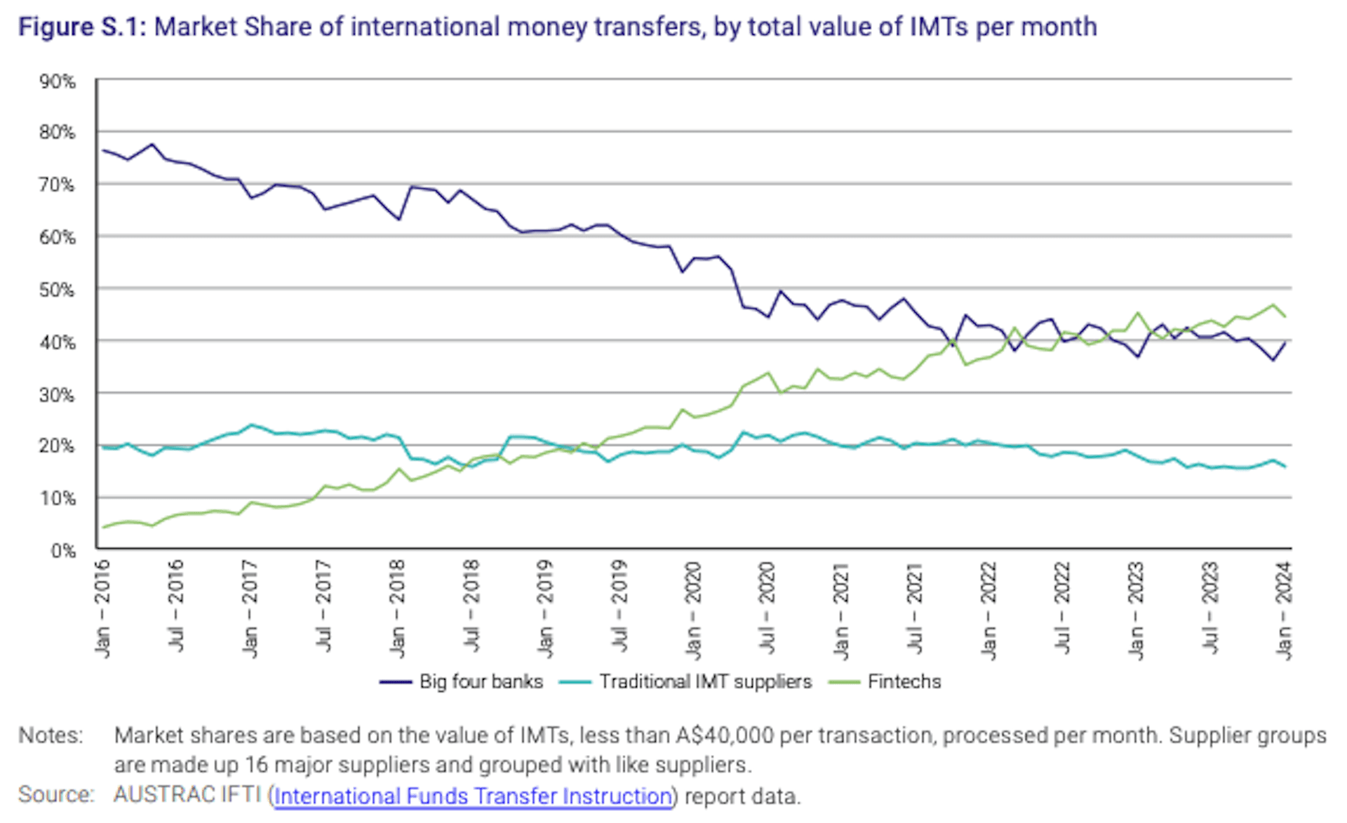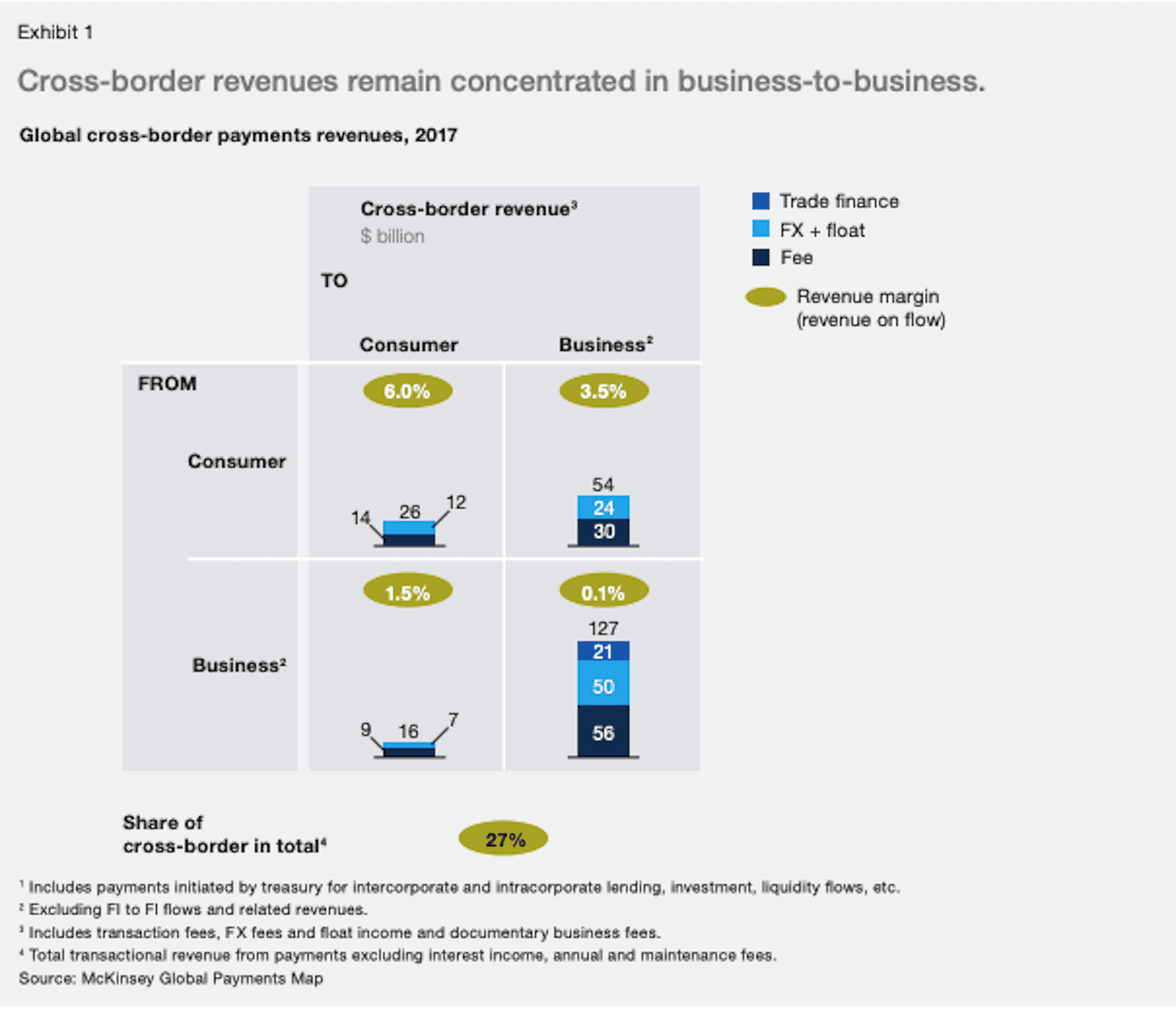 Banks power 92% of B2B cross-border payments. However, they are being challenged specially in the B2C category. An Australian study on sub $25k transfers shows that fintechs are eating into banking market share in low value transactions.