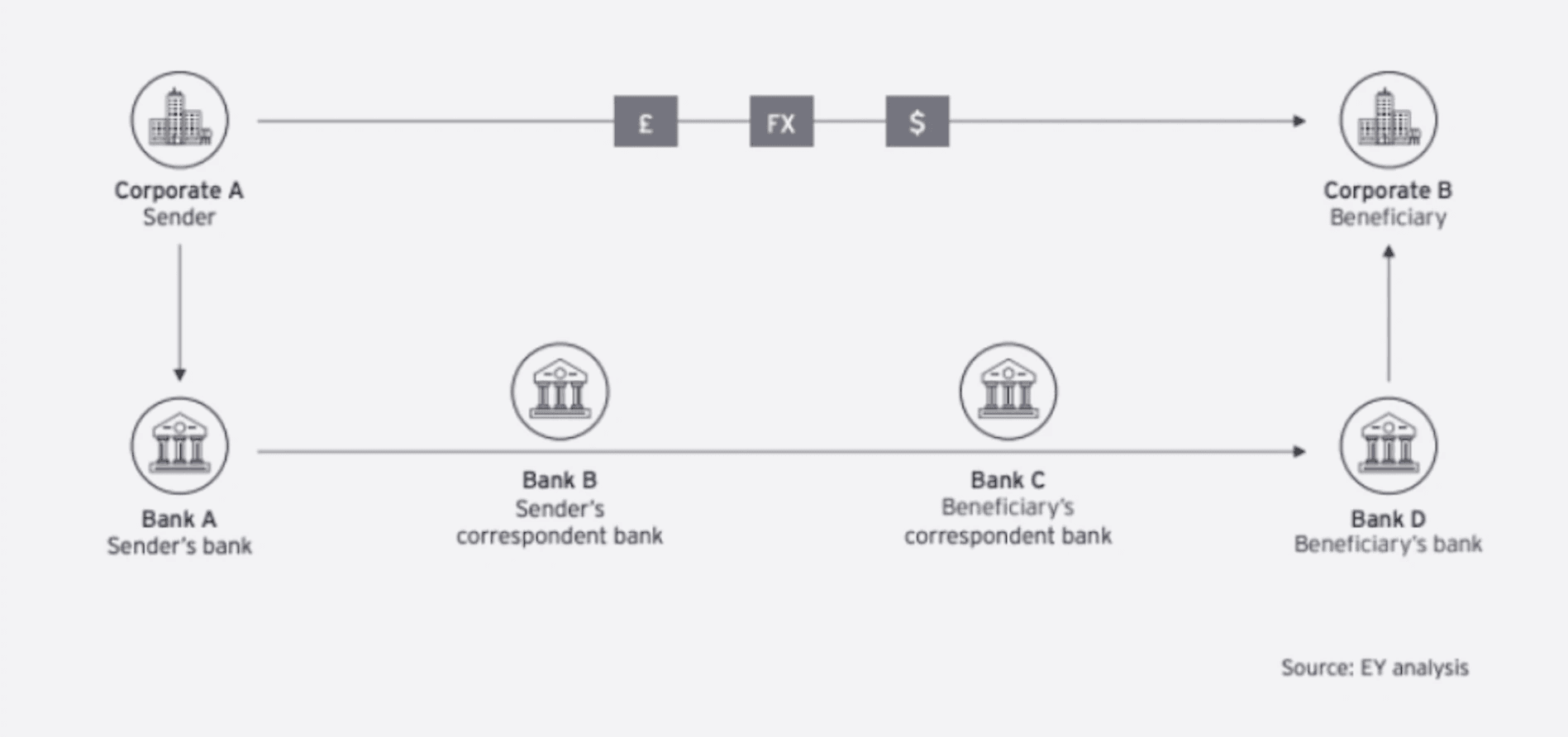Traditional method: payments move through correspondent banks over SWIFT, with daily cut-offs and multiple intermediaries. Money must be pre-funded in foreign accounts (nostro/vostro), adding fees, delays, and tying up cash.