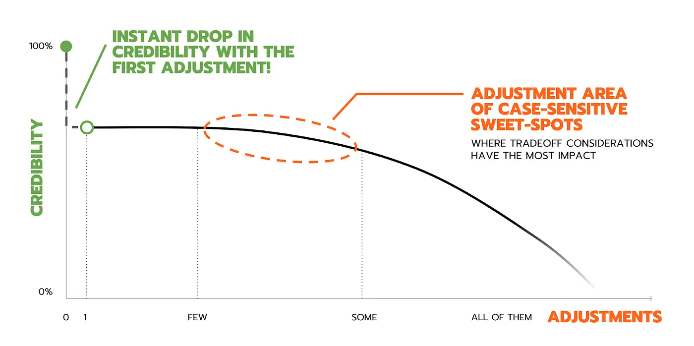 One of the most common examples I see in fundraising contexts is adjusting EBITDA. When founders first hear they can make adjustments, they often go ‘Okay. Let’s make ALL the adjustments.’ But you need to think about the trade-offs. If you do zero adjustments, you have 100% credibility — it’s just the ground truth. But as you start making adjustments, your credibility drops.
